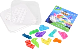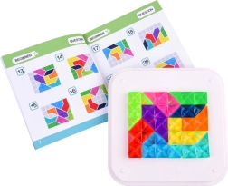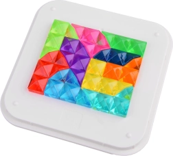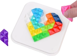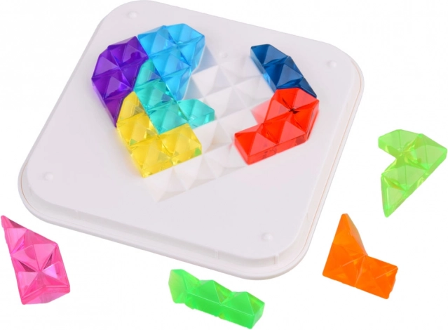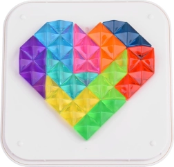 Ontdek onbeperkte mogelijkheden voor creatief maken met deze unieke diamanten puzzel. De set bevat 10 gekleurde kunststof stukjes die kunnen worden gevormd tot verschillende patronen volgens het bijgevoegde boekje of uw eigen verbeelding. Het bord heeft twee zijden – een met een hart en de andere met een vierkant. Alle stukken kunnen na het spelen praktisch worden opgeborgen in de doorzichtige doos, wat opruimen en opbergen vergemakkelijkt.