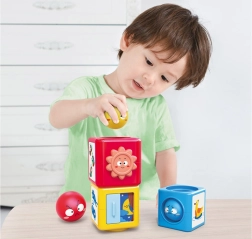 Kleurgecodeerde ballen kunnen in blokken worden geplaatst, wat het kind vertrouwd maakt met begrippen als zwaartekracht en traagheid.
