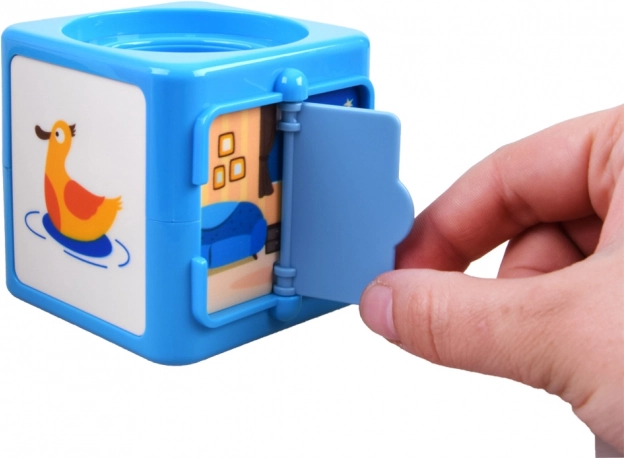 - Blauw blok heeft: raam met klepjes, sterren aan de nachtelijke hemel, kamerbanken, één eendje, aardbei, openingen voor de ballen.