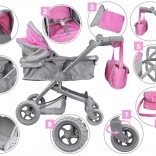 Voor maximaal speelcomfort is er een verstelbare wieg, een omkeerbare duwbeugel voor/achter en een inklapbare kap. Twee zwenkende voorwieltjes en massieve EVA-wielen zorgen voor een soepele rit binnen en buiten. In de ruime mand en de meegeleverde tas berg je alle popaccessoires op.