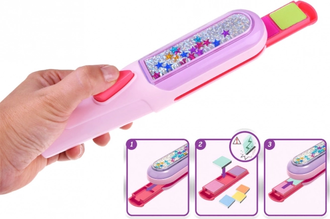 Om je haar er perfect uit te laten zien, begin je met het bevochtigen van het haar. Trek de plaat uit de applicator en plaats je keuze van gekleurd krijt erin. Schuif het dan weer terug in de applicator en trek eenvoudig over het haar voor directe resultaten. Voor een intensere uitstraling, herhaal het proces meerdere keren op dezelfde haarlok.