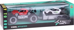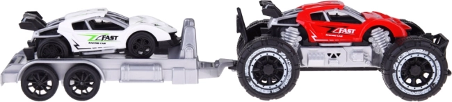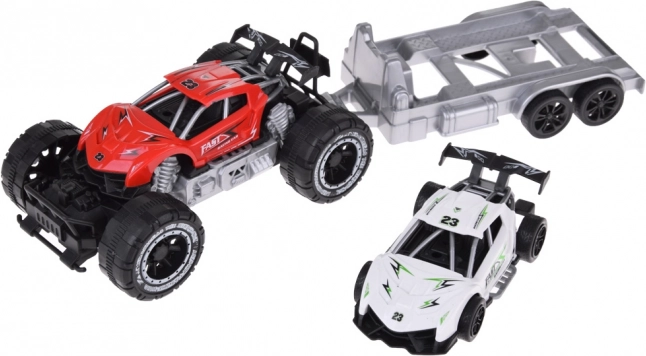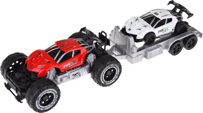Terreinwagen en sportautootje met aanhanger biedt plezier voor elke kleine motorliefhebber. De autootjes zijn gemaakt van plastic, de aanhanger is ideaal voor het vervoeren van de raceauto naar wedstrijden.