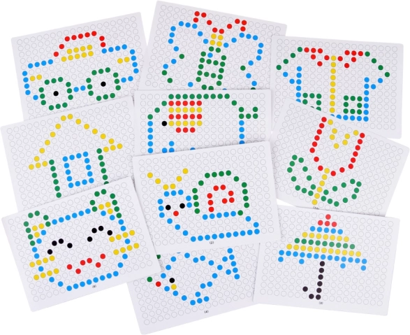 Bij de set horen kaarten met motieven (auto, huis, vis, bloem e.d.) die kinderen met behulp van de kleurrijke pinnetjes op het raster overbrengen. Het leren van vormen en patronen is leuk en intuïtief.