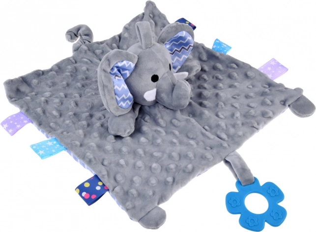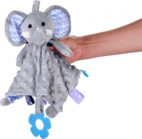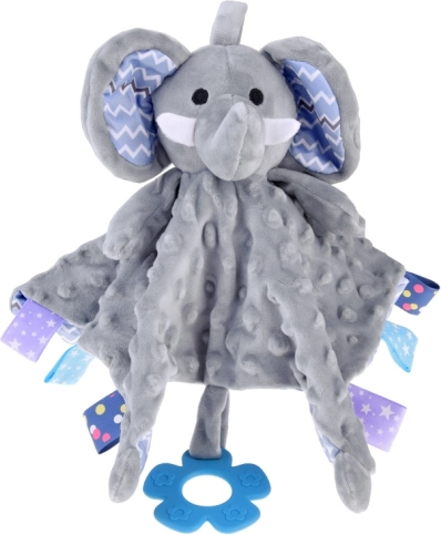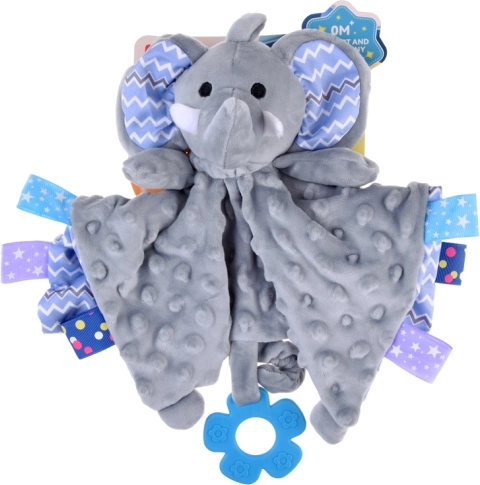 Een schattig pluchen knuffeldoekje in de vorm van een olifantje biedt je baby een zachte aanraking, een siliconen bijtring voor verlichting bij doorkomende tandjes en verschillende texturen en labeltjes voor tactiele ontdekking. Licht, veilig en ideaal voor in de wieg, kinderwagen en autostoeltje.