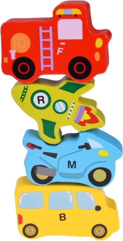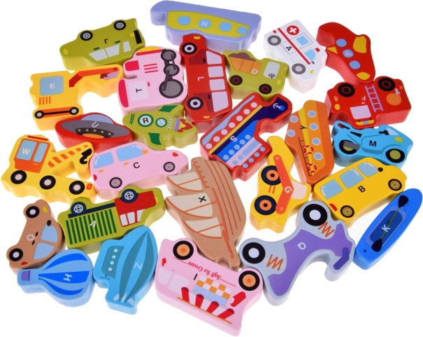 Deze houten set bevat 27 kleurrijke voertuigen – van auto, bus en brandweerwagen tot ballon, schip, raket en luchtschip – en een houten basis met gemarkeerde namen. Elk stukje draagt een letter A–Z (inclusief een speciaal motief), wat kinderen helpt het alfabet op een speelse manier te leren en hun woordenschat uit te breiden.