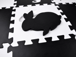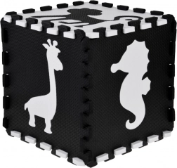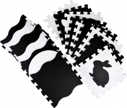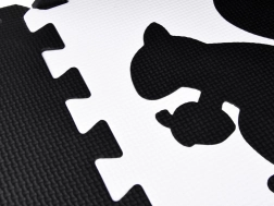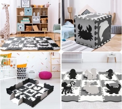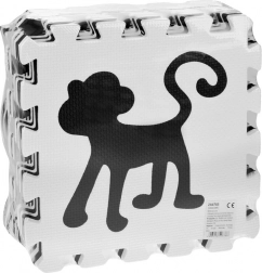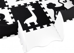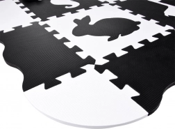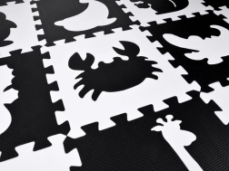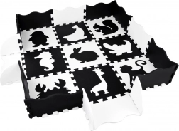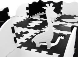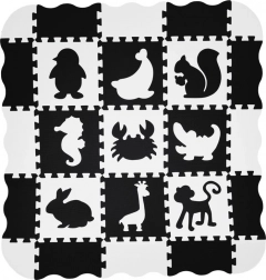 Deze contrasterende schuimmat met dierenmotieven combineert een moderne look met praktische functionaliteit. 16 zachte tegels van 30 × 30 × 1 cm leg je eenvoudig tot 120 × 120 cm, of pas je aan de ruimte aan. Sommige tegels hebben uitneembare middenelementen, die fijne motoriek ondersteunen en helpen bij het leren van vormen en dieren.
