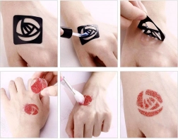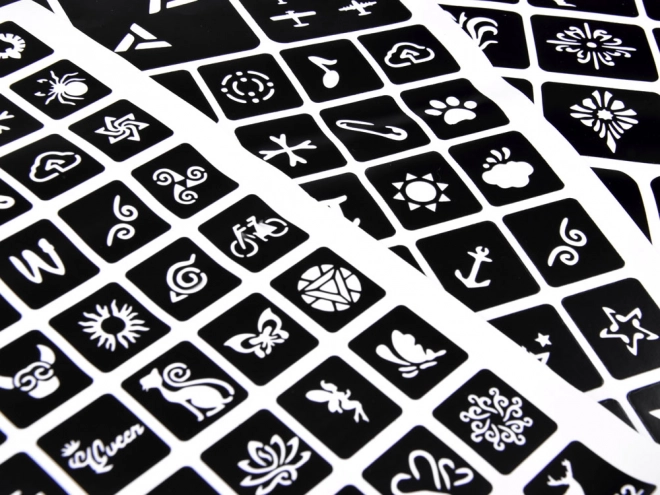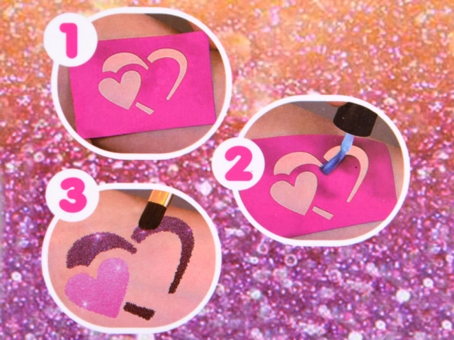 Handleiding: Kies een sjabloon en plak het op schone huid, breng het ontwerp aan met lijm, verwijder het sjabloon, voeg glitterkleuren toe en klaar!