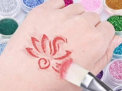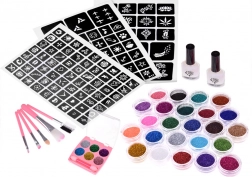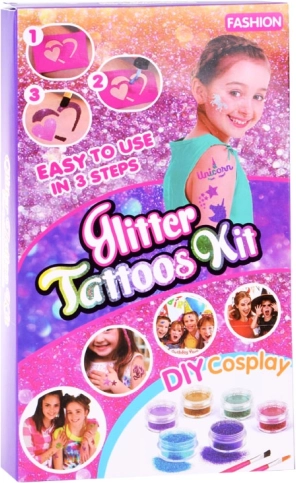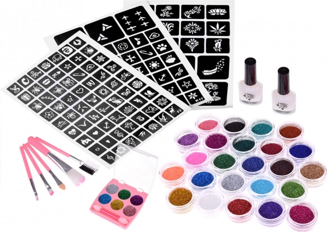 Met deze set voor glittertatoeages kun je direct prachtige glinster-tatoeages maken. Bevat 120 sjablonen in verschillende maten, 24 potjes met mooie glitters en 2 flesjes lijm, genoeg voor heel wat tatoeages. Ook inbegrepen zijn glinsterende oogschaduws en een set kwasten voor een perfecte stylinglook.