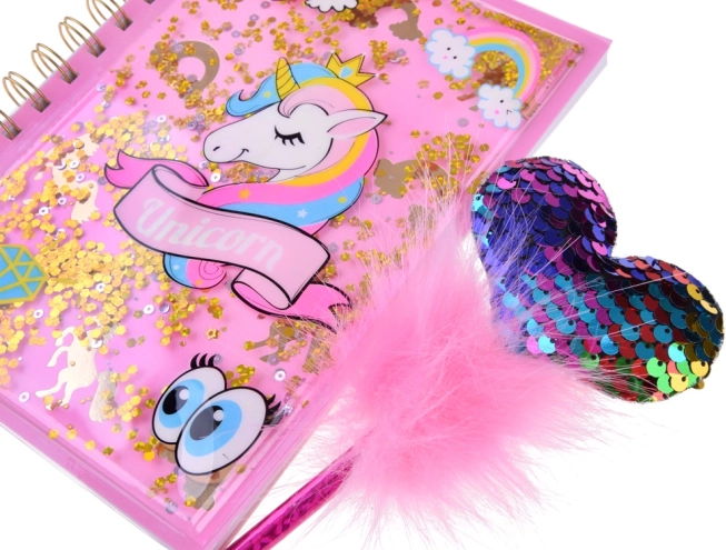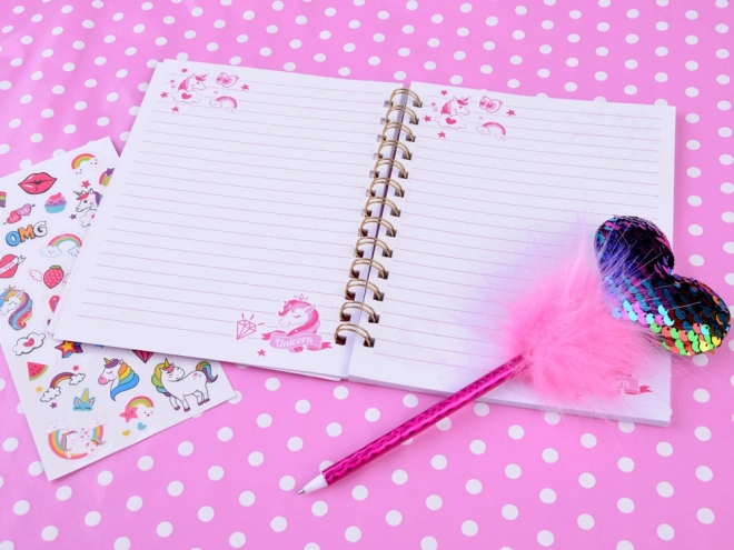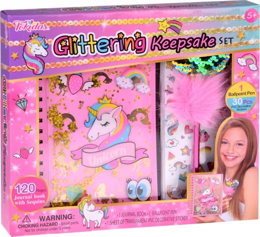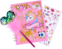 Dit magische dagboek met eenhoornmotief biedt de ideale ruimte voor het opschrijven van uw gedachten, geheimen en ideeën. Met een glanzende omslag bezaaid met glinsterende deeltjes geeft het het dagboek een unieke en aantrekkelijke uitstraling. De uitnodigende set bevat ook een roze pen met een donzige pompon en een glinsterend hart, samen met kleurrijke stickers voor creatieve decoratie.