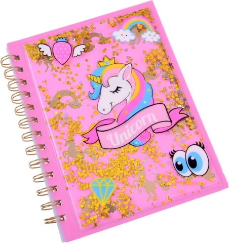 Notitieboekje met roze achtergrond en gouden glitter valt op vanwege zijn magische design, dat uitnodigt tot schrijven en tekenen.