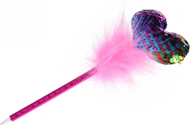 Roze pen met pailletten en een donzige topper voegt charme toe aan elke notitie.