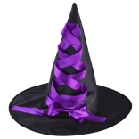 De zwarte heksenhoed is versierd met een paarse satijnen band. De stevige vorm en het sterke kleurcontrast benadrukken de magische look.
