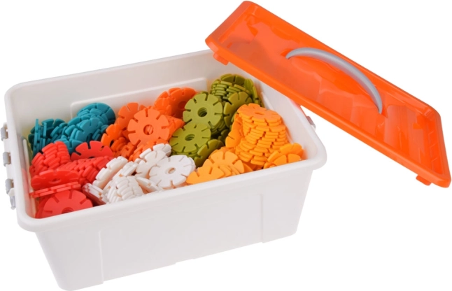 Een plastic doos met deksel en handvat maakt het gemakkelijk om de bouwset op te slaan en te vervoeren.