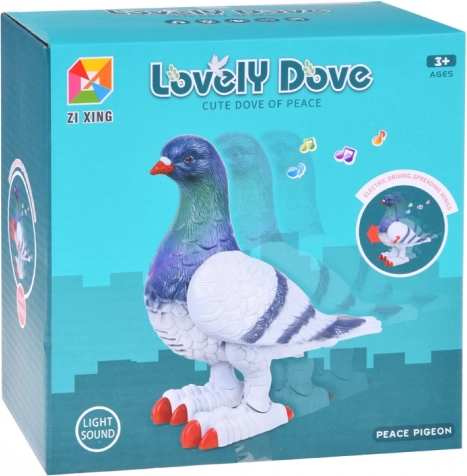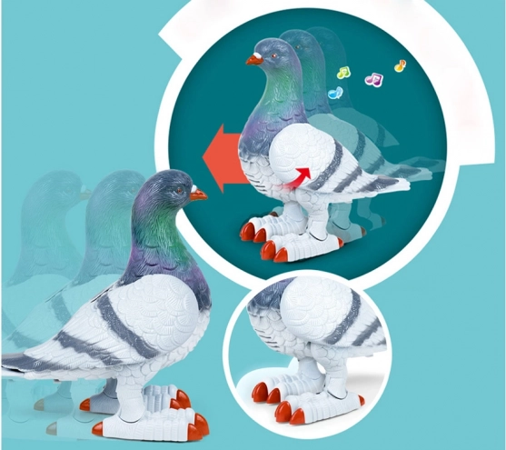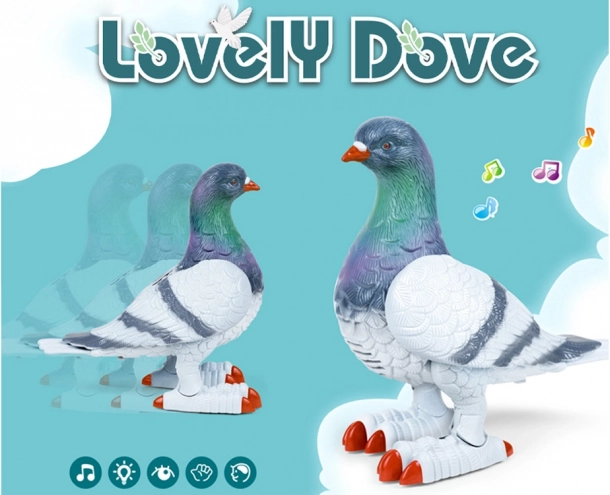 De interactieve duif kan langzaam vooruit bewegen, met de vleugels fladderen en met de ogen knipperen, wat vergezeld gaat van een vrolijke melodie.