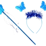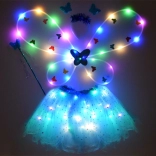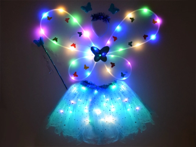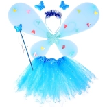 Dit prachtige feeënkostuum in blauwe kleur zal elk klein meisje blij maken. Het kostuum omvat een rok met LED-verlichting, vleugels, een haarband en een toverstok, en biedt een magische ervaring voor elke gelegenheid.