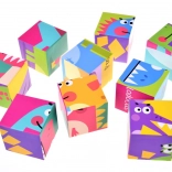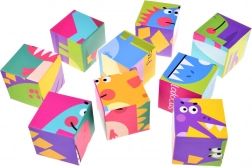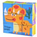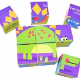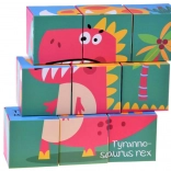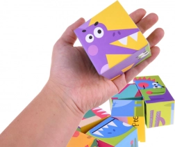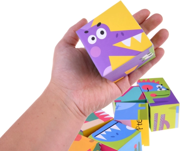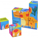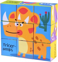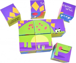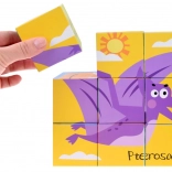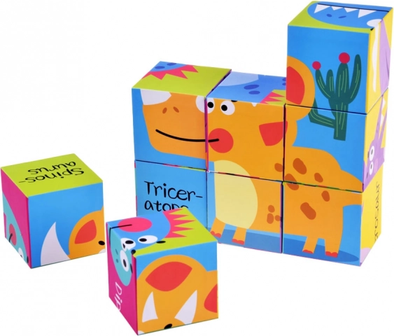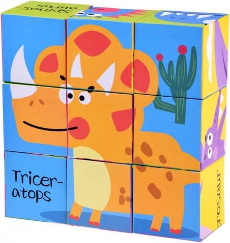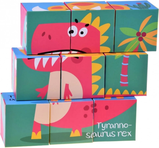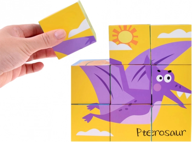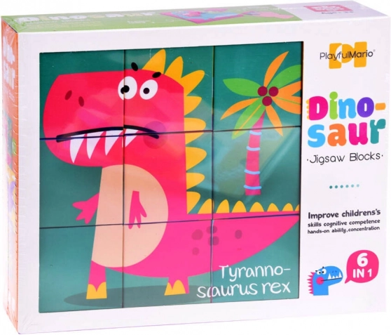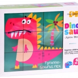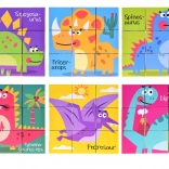 Negen blokjes maken het mogelijk om zes verschillende dinosaurusafbeeldingen te maken met behulp van kleurrijke illustraties voor gemakkelijk leren.