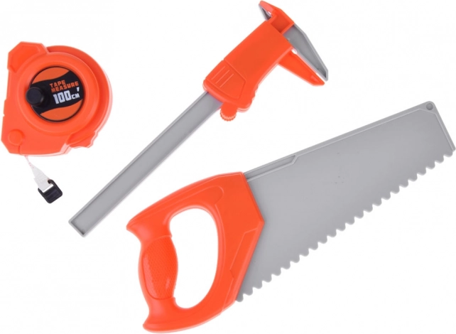De set bevat diverse tools zoals een meetlint en schroeven en moeren, die de creativiteit van kinderen tijdens het spelen stimuleren.