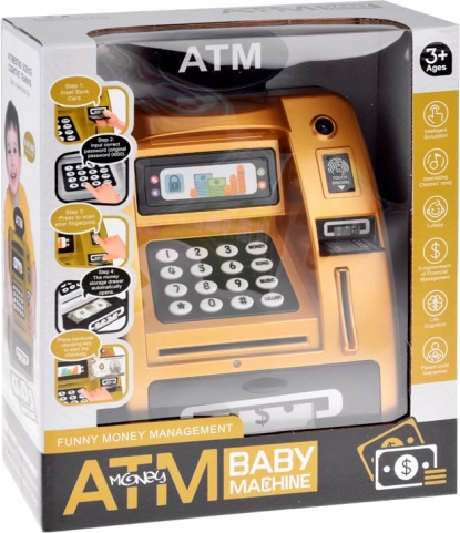 Maak kennis met de gouden geldautomaat, die eruitziet en werkt als een echte ATM. Hij is gemaakt van plastic met een realistisch ontwerp, inclusief een toetsenbord, digitaal display en kaartsleuf. Door de speelkaart in te voeren en een pincode in te toetsen, activeren kinderen de functies van de geldautomaat.