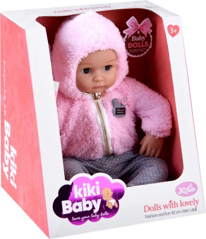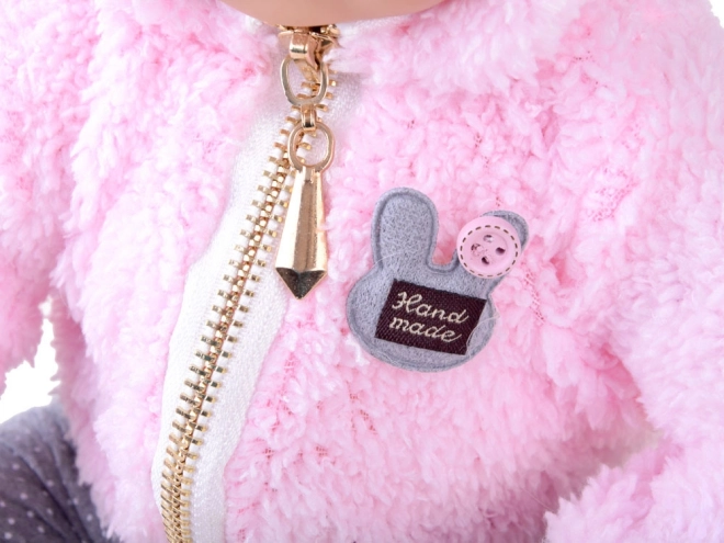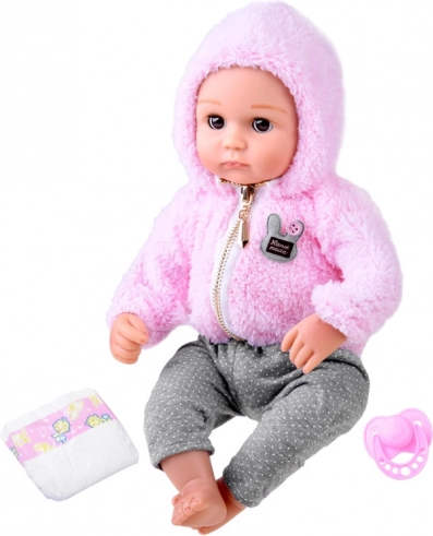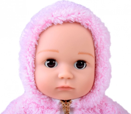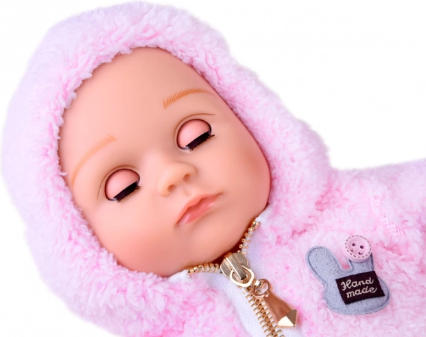 De pop ziet eruit als een pasgeboren baby. Ze heeft een zacht stoffen lijfje en een hoofd, armen en benen van hard rubber. Wanneer je de pop neerlegt, sluiten haar ogen. Net als een echte baby heeft ze geen haartjes op haar hoofd, maar voor de winter wordt ze warm gehouden door een zachte, comfortabele roze hoodie met capuchon. De outfit wordt compleet gemaakt door stijlvolle grijze leggings met stippen.