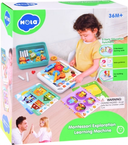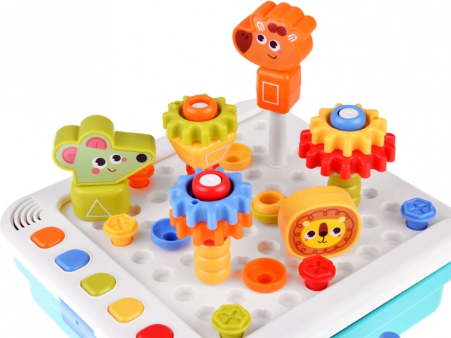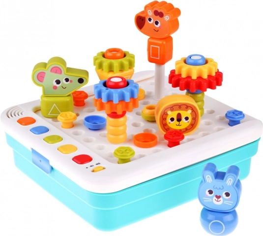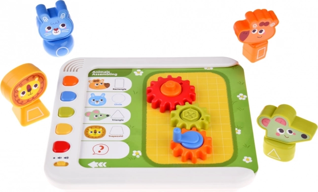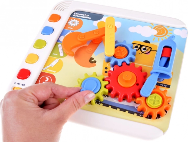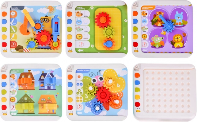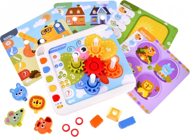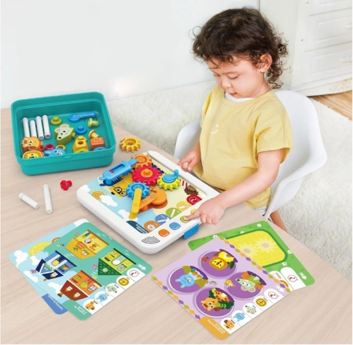 De set bevat een elektronisch paneel, een lade voor onderdelen, 5 thematische kaarten, kleurige blokjes en tandwielen, dierenfiguren (giraf, konijn, muis, leeuw) en een kleurrijk geïllustreerd boekje. Het kind kan bewegende constructies bouwen, de oog-handcoördinatie ontwikkelen en tandwielmechanica begrijpen. De rode knop op het paneel start extra uitdagingen voor nog meer plezier.