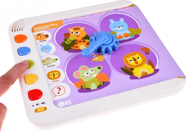 Het paneel leert kinderen basisemoties herkennen met duidelijke afbeeldingen en gesproken begeleiding. De draaibare wijzer en het kiezen van de juiste emotie ondersteunen de sociaal-emotionele ontwikkeling.