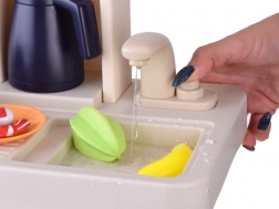 De gootsteen met kraan pompt water in een gesloten circuit. Zo kunnen kinderen “eten” en servies “wassen” zonder rommel en met maximaal plezier.