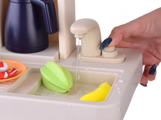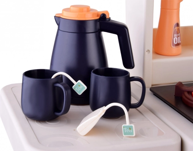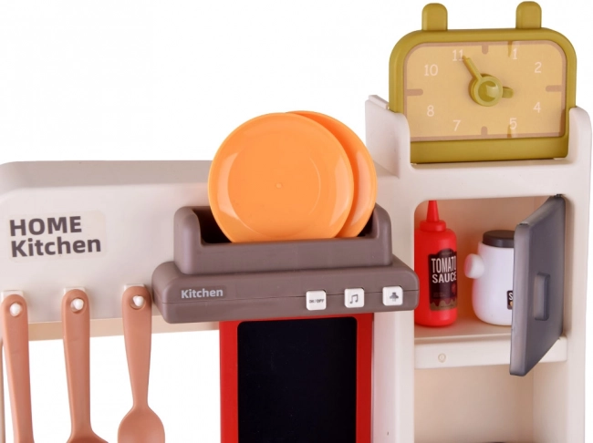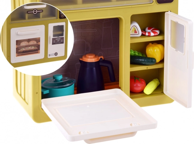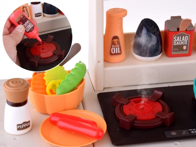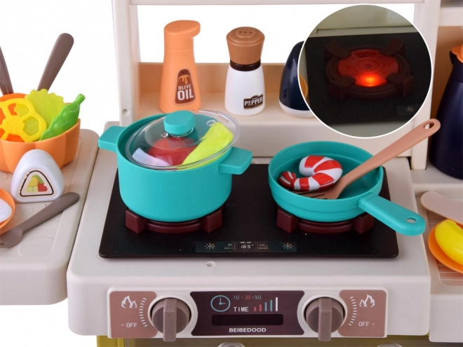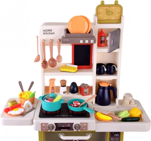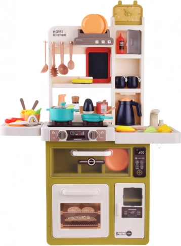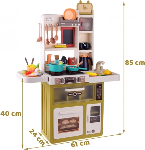 Deze interactieve keuken geeft kinderen een authentieke kookervaring. Hij is uitgerust met een fornuis met twee kookplaten, een oven, een koelkast, een vaatwasser, een gootsteen met functionele kraan in een gesloten circuit en bovenplanken met haakjes. Na het vullen van het reservoir (ca. 40 ml) stijgt er tijdens het koken realistische stoom op uit één brander en lichten de kookplaten op. De afzuigkap biedt melodieën en geluiden die het spel nog levendiger maken.