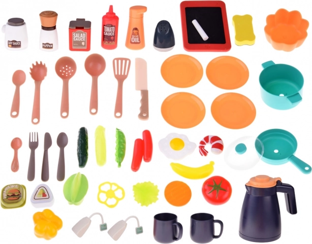 Dankzij de 49-delige accessoires set bereiden kinderen eenvoudig het “menu van de dag” – van groenten en eieren, via sushi en hamburger, tot aan smaakmakers. Een pan met deksel, koekenpan, keukengerei, borden, kopjes en een mini krijtbord ontbreken niet. De constructie is duurzaam en veilig, gemaakt van hoogwaardige kunststof met oog voor detail.
