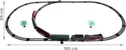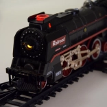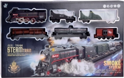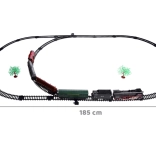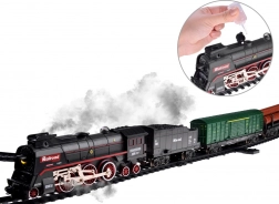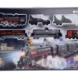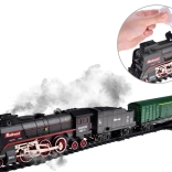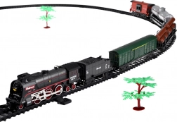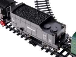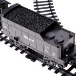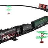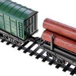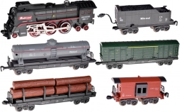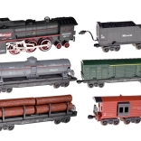 Inclusief zes verschillende wagons: tender met kolen (voeding van de set), tankwagon, gesloten goederenwagon, platformwagon voor boomstammen, veewagon en dienstwagon.