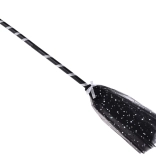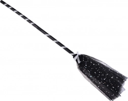 Opvouwbare bezem met zwart-wit spiraalpatroon en decoratieve franjes geeft het kostuum een speelse touch.
