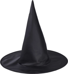 Traditionele zwarte heksenhoed met hoge punt en brede rand maakt het kostuum helemaal af.