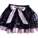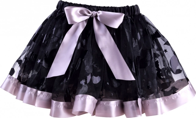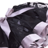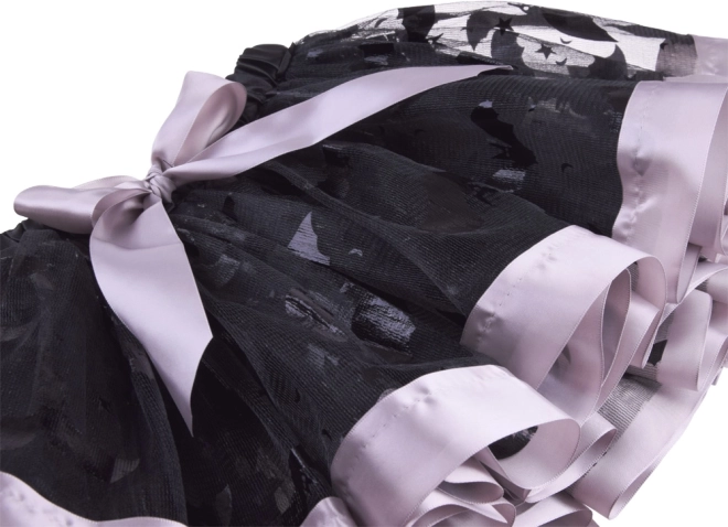 Zwarte netrok met decoratieve patronen, paarse bies en strik. De elastische taille zorgt voor comfort en gemakkelijk aankleden.