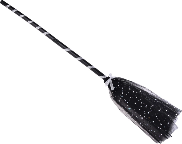 - Puntige zwarte hoed, luchtige rok met elastiek, opvouwbare bezem