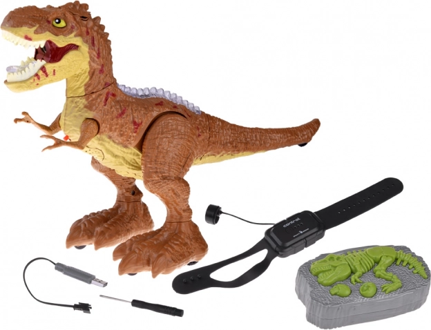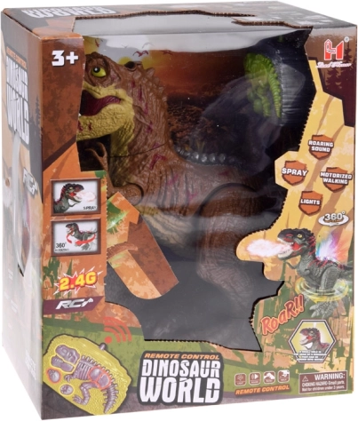 Het model is uitgewerkt met oog voor realistische details, heeft lichtelementen op de rug en een rood verlichte bek. In de doos vind je alles wat je nodig hebt: RC‑controller, sensorarmband, 3,7 V 500 mAh accu, USB‑lader, schroevendraaier en een pipet om water bij te vullen voor het stoom‑effect.