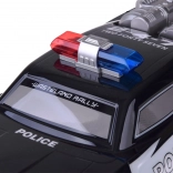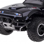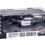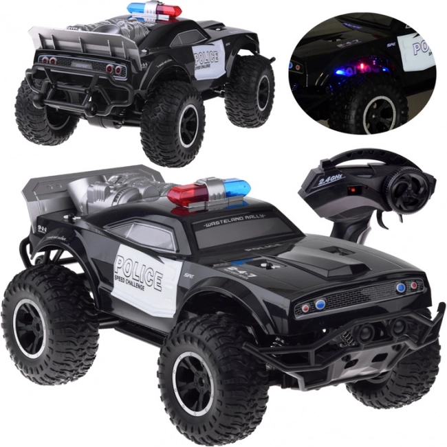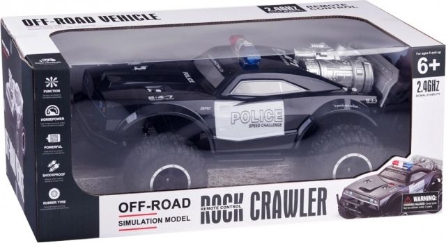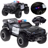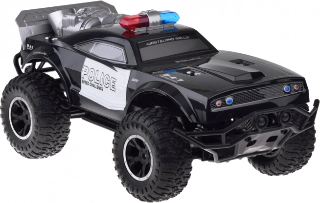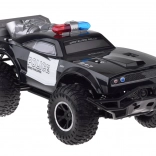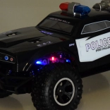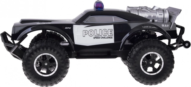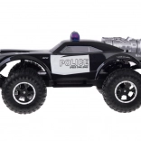 Deze grote monstertruck is gemaakt van flexibel plastic, waardoor hij licht is. De grote rubberen wielen met geveerde schokdempers zorgen voor uitstekende grip op het terrein en gemakkelijk manoeuvreren in bochten. Het voertuig is uitgerust met een verstelbare wieluitlijning, wat bijdraagt aan betere besturing. Een echte attractie is zijn rood-blauwe knipperende verlichting, die politielichten nabootst en in het donker een realistische ervaring biedt.