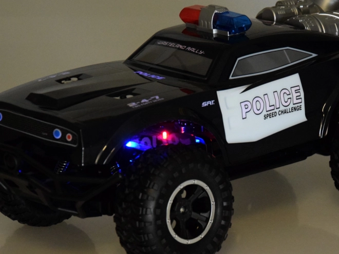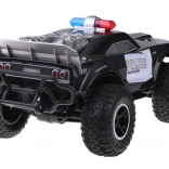 De monstertruck kenmerkt zich door een robuust ontwerp met opvallende politie-elementen, inclusief rood-blauw licht en POLICE opschriften.