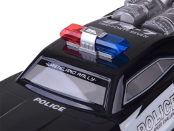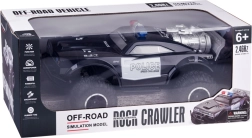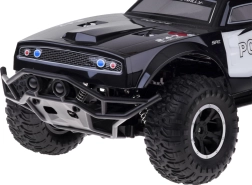 Deze grote monstertruck is gemaakt van flexibel plastic, waardoor hij licht is. De grote rubberen wielen met geveerde schokdempers zorgen voor uitstekende grip op het terrein en gemakkelijk manoeuvreren in bochten. Het voertuig is uitgerust met een verstelbare wieluitlijning, wat bijdraagt aan betere besturing. Een echte attractie is zijn rood-blauwe knipperende verlichting, die politielichten nabootst en in het donker een realistische ervaring biedt.