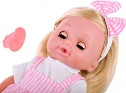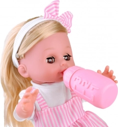 De pop draagt prachtige witte en roze bloemenjurkjes en een wit shirt. Ze is uitgerust met een plasfunctie, zodat kinderen leren hoe ze voor een baby moeten zorgen. Een realistisch gevoel wordt geboden door het hoofd, de armen en benen van hard rubber.