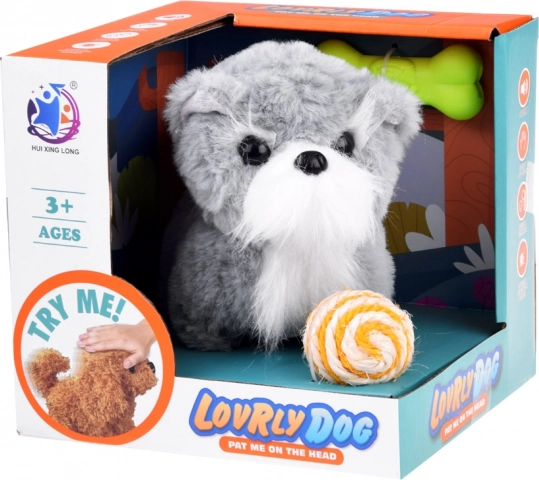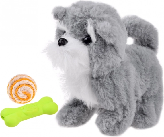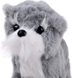 Heldere, glanzende ogen, een realistische snuit en zachte grijze pluche maken van de hond een geweldige metgezel zowel om mee te spelen als als decoratie.