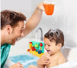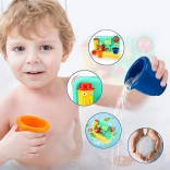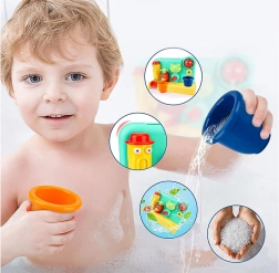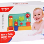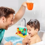 Giet eenvoudig water met de douche of de bijgeleverde beker in het bovenste deel van het speelgoed en zie hoe het water door de verschillende delen stroomt en verschillende effecten creëert: