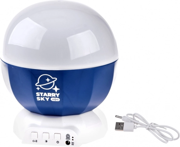 De projector is uitgerust met een eenvoudig bedieningspaneel met knoppen voor aan/uit, het wijzigen van de lichtmodus en het activeren van muziek. Voeding is mogelijk via USB of met batterijen.