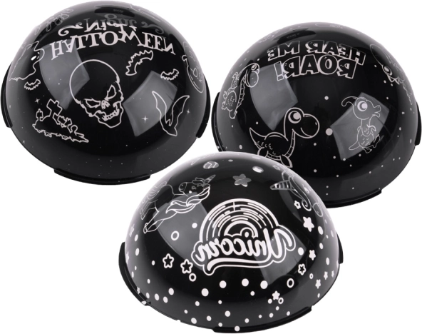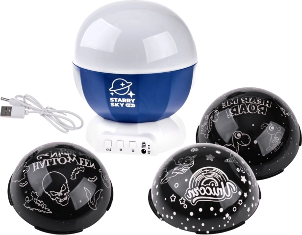 De projector is uitgerust met een LED-basis en drie verwisselbare koepels met Halloween-, Eenhoorn- en Dinosaurusmotieven. Elke koepel biedt verschillende patronen die de sfeer in de kamer aanpassen. In de verpakking zit een USB-kabel voor eenvoudige voeding en er is ook de mogelijkheid om 3x AA-batterijen te gebruiken (niet inbegrepen).