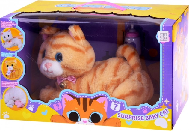 In de doos: kattenmama, 2 kittens (verstopt in het buikje) en een flesje. Voeding: 3× AAA (niet inbegrepen). Ideaal als cadeau voor kinderen vanaf 3 jaar en voor dagelijks knuffelen en verzorgend spelen.