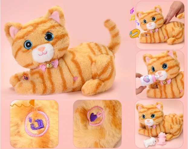 Houd het flesje bij het bekje en de kat maakt drinkgeluidjes. Wanneer je de kittens bij het hartje op het buikje houdt, hoor je realistische zuiggeluidjes.
