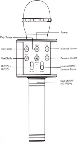 - PREV, NEXT, pauze/play (SCAN), REC/stemmodulatie, VOL +/-, MIC VOL, REMIX/ECHO
