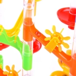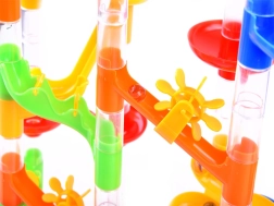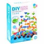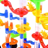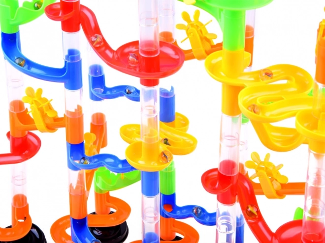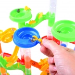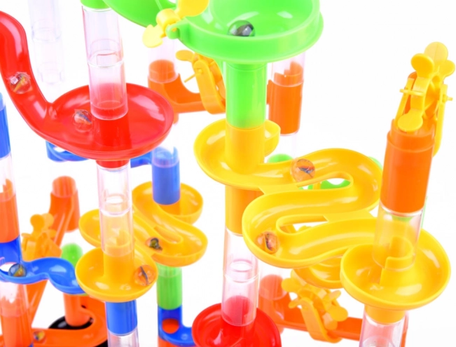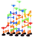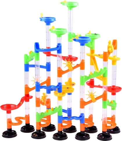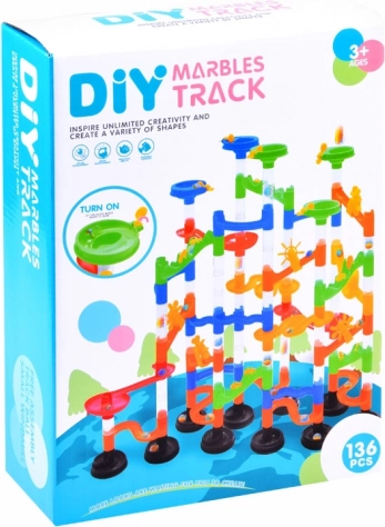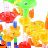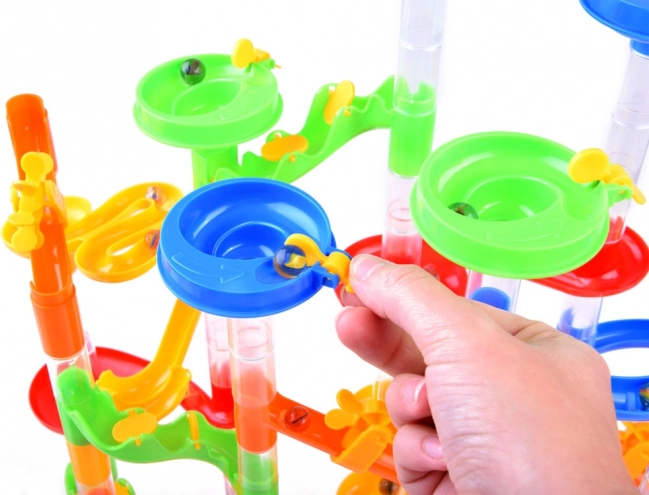 Deze knikkerbaan is ideaal voor kinderen die van bouwen en experimenteren houden. Van gekleurde plastic onderdelen bouw je eenvoudig spiralen, bruggen, schoorstenen en carrousels en creëer je originele banen waar de knikkers vloeiend doorheen rollen. De set bevat ook een ruime hoeveelheid knikkers voor dynamisch spel.