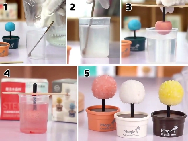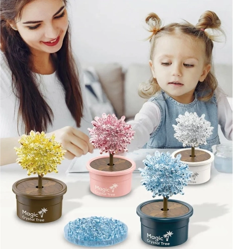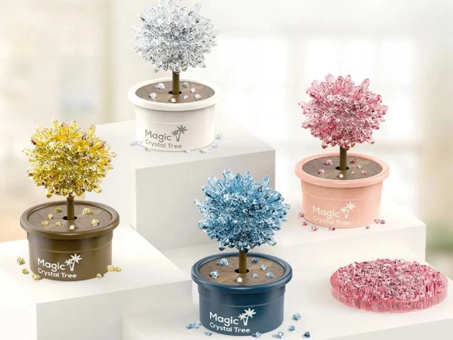Verschillende kleurvarianten van de kristallen boompjes veranderen het experiment in een prachtige decoratie. Als er geen specifieke tint wordt gekozen, wordt de kleur willekeurig verzonden.