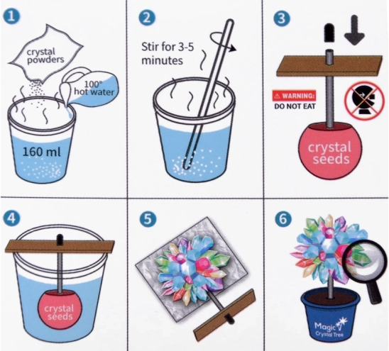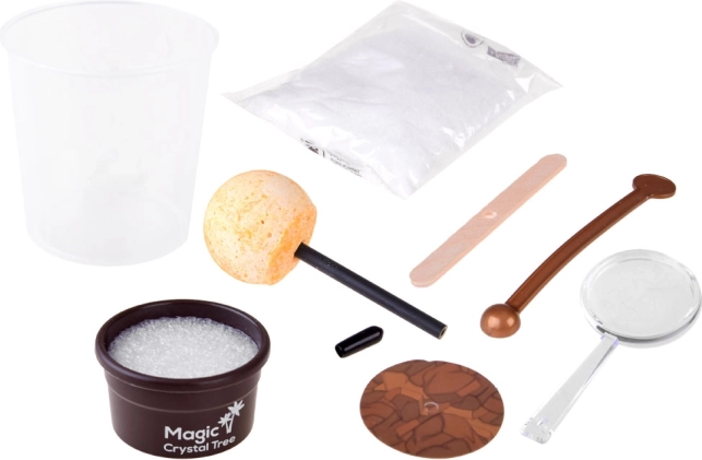 In de set vind je alles wat je nodig hebt: een maatbeker van 200 ml, een zakje met kristalpoeder/zand, een gekleurd kristallen zaadje op een stokje, een roerstokje, een loep voor gedetailleerde observatie, een houten plaatje, een stopper en een klein bloempotje (standaard). De werkwijze is eenvoudig en veilig: volg de instructies en werk met heet water onder toezicht van een volwassene.
