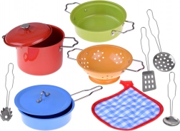Een kleurrijke metalen set voor kleine koks die realistisch kookspel mogelijk maakt. Bevat potten, pan, vergiet en keukengerei en is ideaal voor de ontwikkeling van fantasie, fijne motoriek en rollenspel in de kinderk keuken.