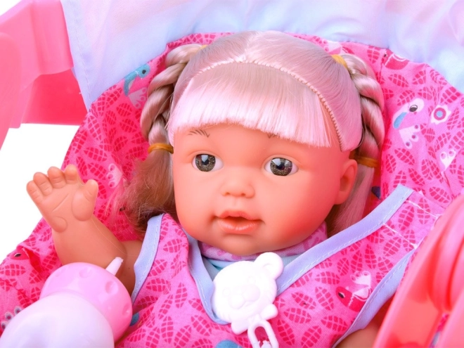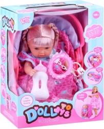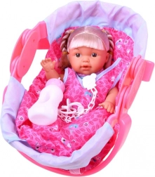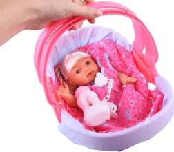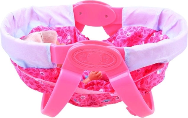 De set bevat een plastic pop met beweeglijke ledematen en een rubberen gezicht. De draagmand is gemaakt van hoogwaardige kunststof met beweeglijke handvatten en riemen om bijvoorbeeld aan bagage te bevestigen. Past perfect in elke kinderkamer. Dankzij de royale afmetingen van de draagmand kun je er een pop tot wel 30 cm in plaatsen!